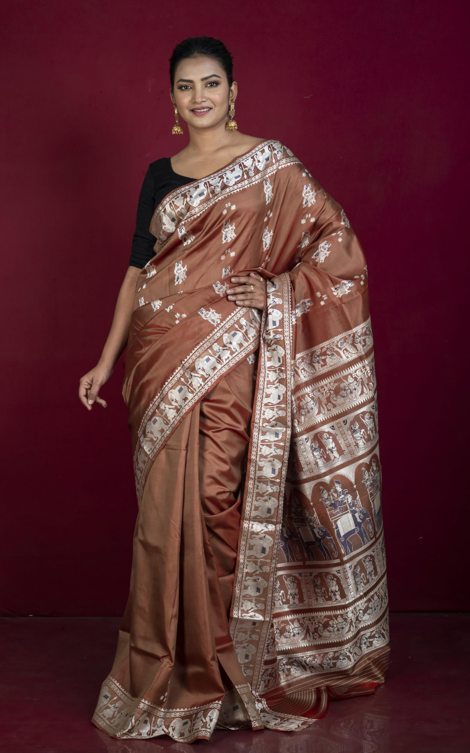 - Premium Bengal Silk: Crafted from premium-quality silk, this saree exudes luxury with its soft texture and elegant sheen, perfect for special occasions.