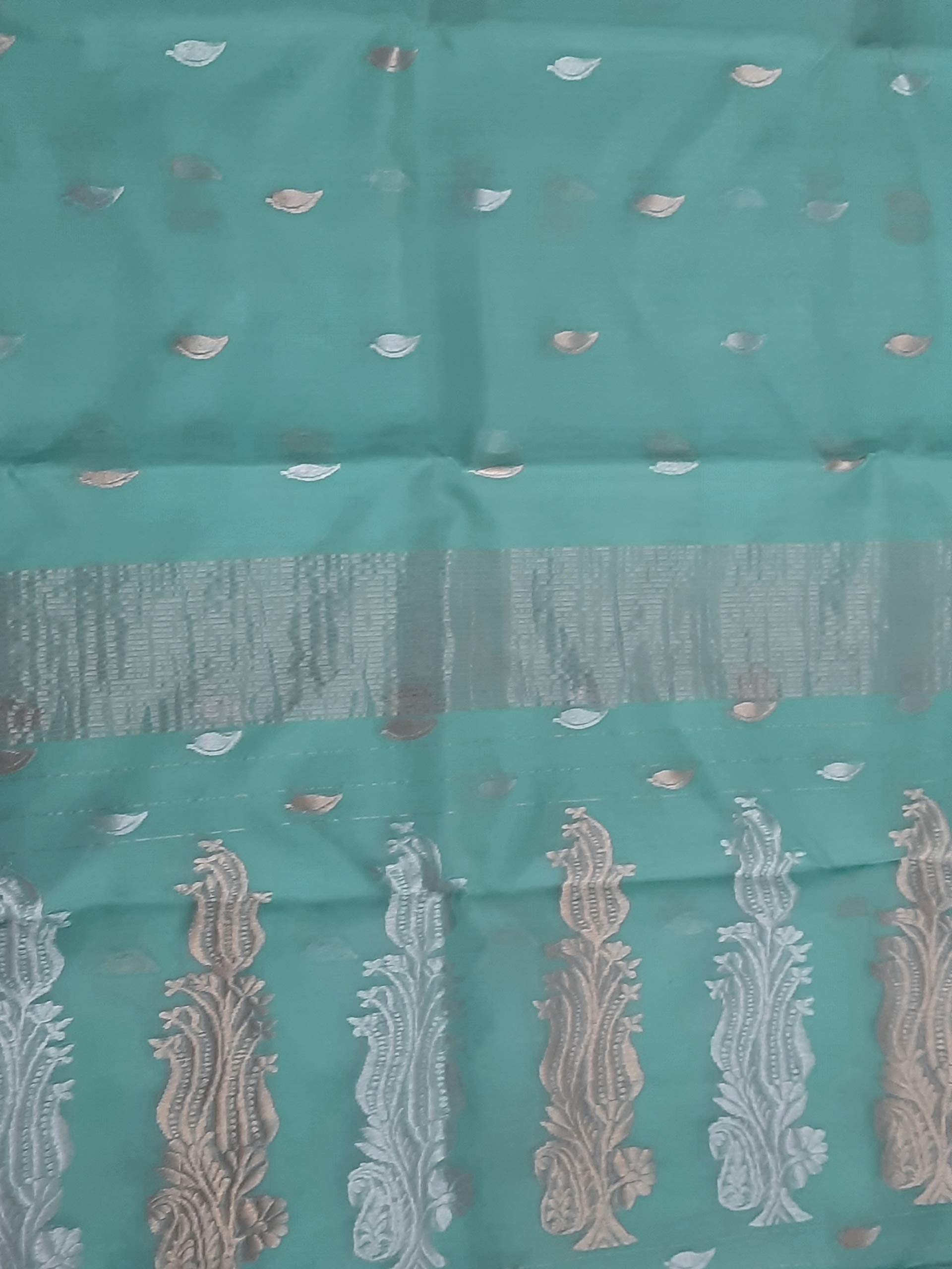 HerClozet is famous for its hand-woven sarees, is a renowned centre for it's traditional weavers. Chanderi sarees have unmatched sophistication and are popular among the Indian upper middle class saree wearers. The traditional weaving of Chanderi fabric is mainly done for making sarees and suit materials. Chanderi fabric is known for its sheer texture, light weight and a glossy transparency.This is Sea Green Traditional Chanderi Katan silk saree with silver golden zari boota weaved all over and golden zari border . This saree is very light weight and easy to drape. Blouse is attached in the saree, saree length is 6.3 Mtr.