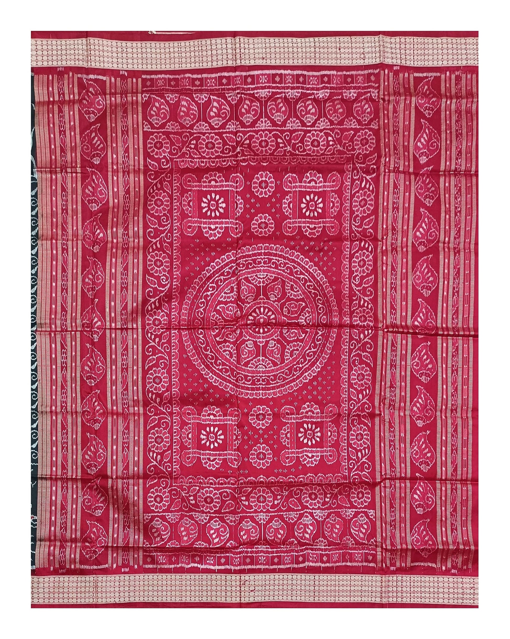 - Colors & Designs: Body in black color base with animals and flowers design, Border in red Color with lining pattern ,Pallu in red color with traditional sambalpuri designs, Blouse Piece in red color.