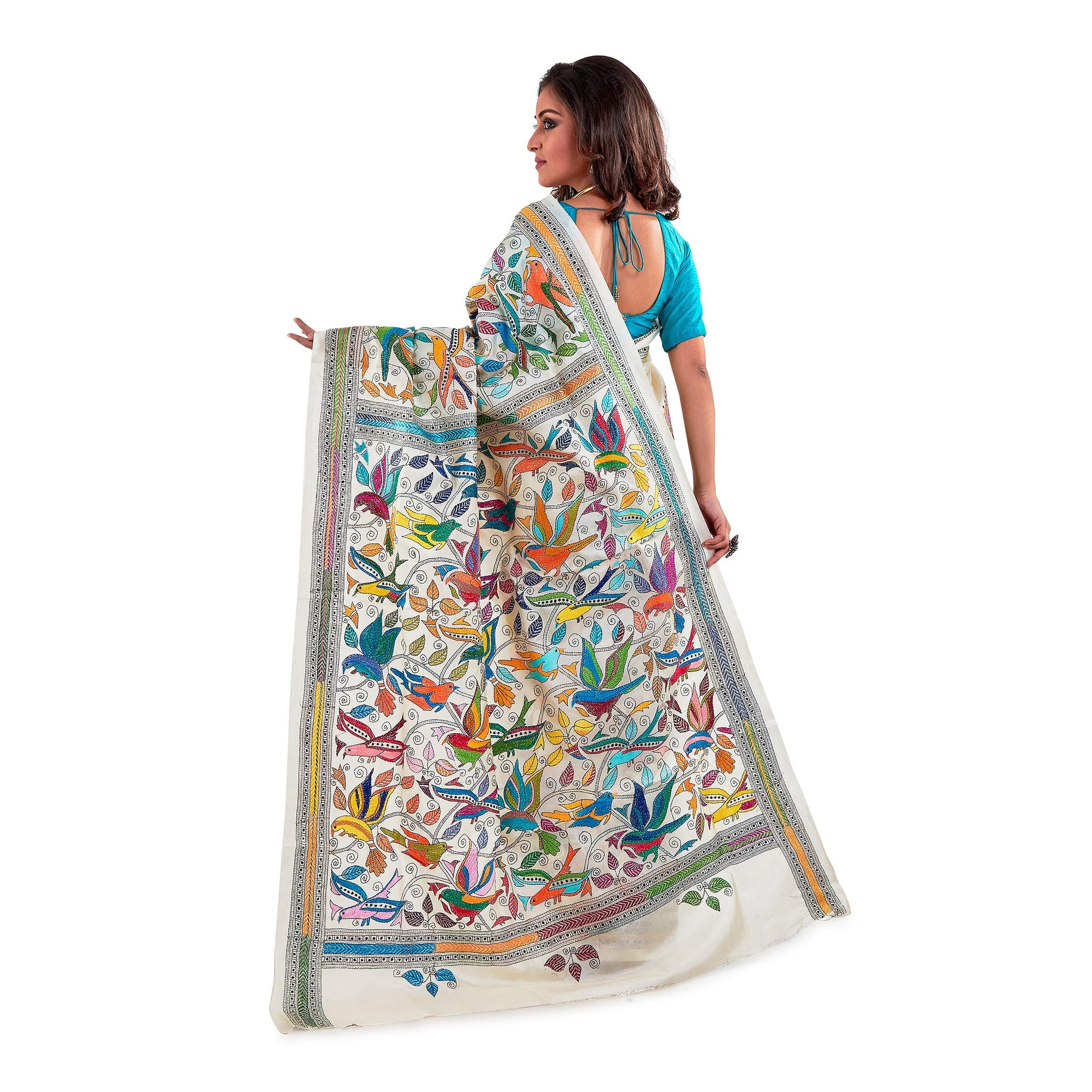 PRANTIKA Women's Pure Bangalore Silk Handloom Kantha Stitch Saree White K157AA